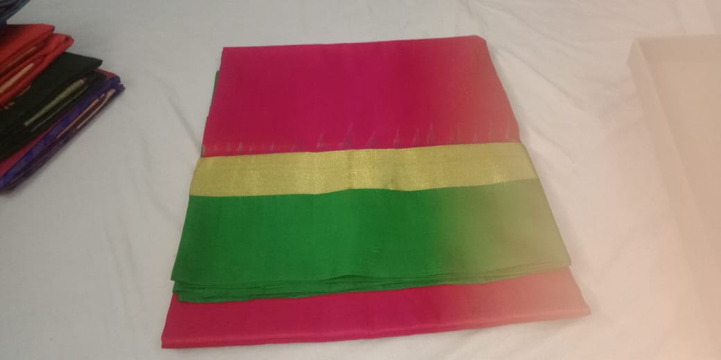 Kanchi Soft Silk Sarees Pink w/ Green Color