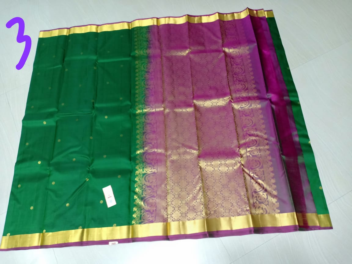 Kanchi Soft Silk Sarees Putta Design Fun Green w/ Magenta Color