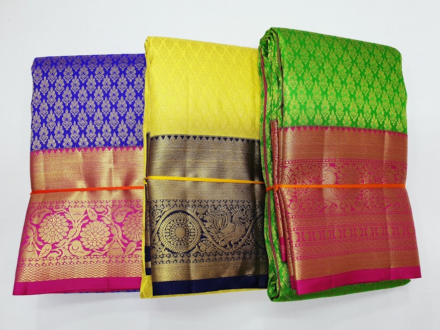 Kanchipuram Pure Silk Saree Bridal Collection Full Koravai Small Border and Big Border WEDDING Sarees (Parrot Green / Lemon Yellow / Blue)