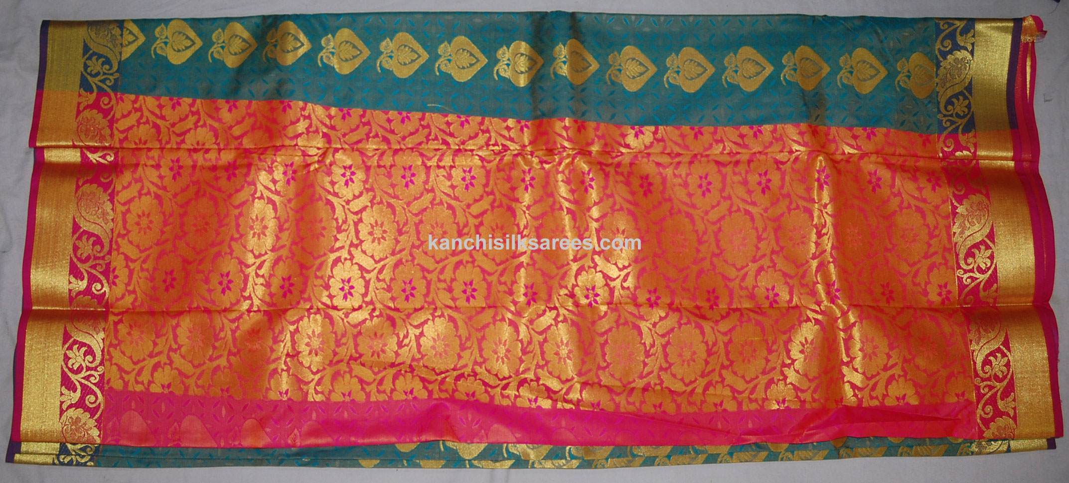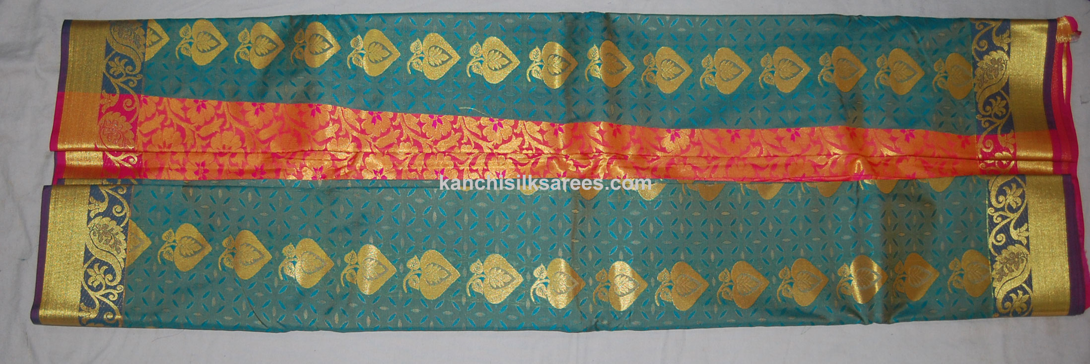 Kanchipuram Soft Silk Sarees Flower Design Dark Green Copper Color