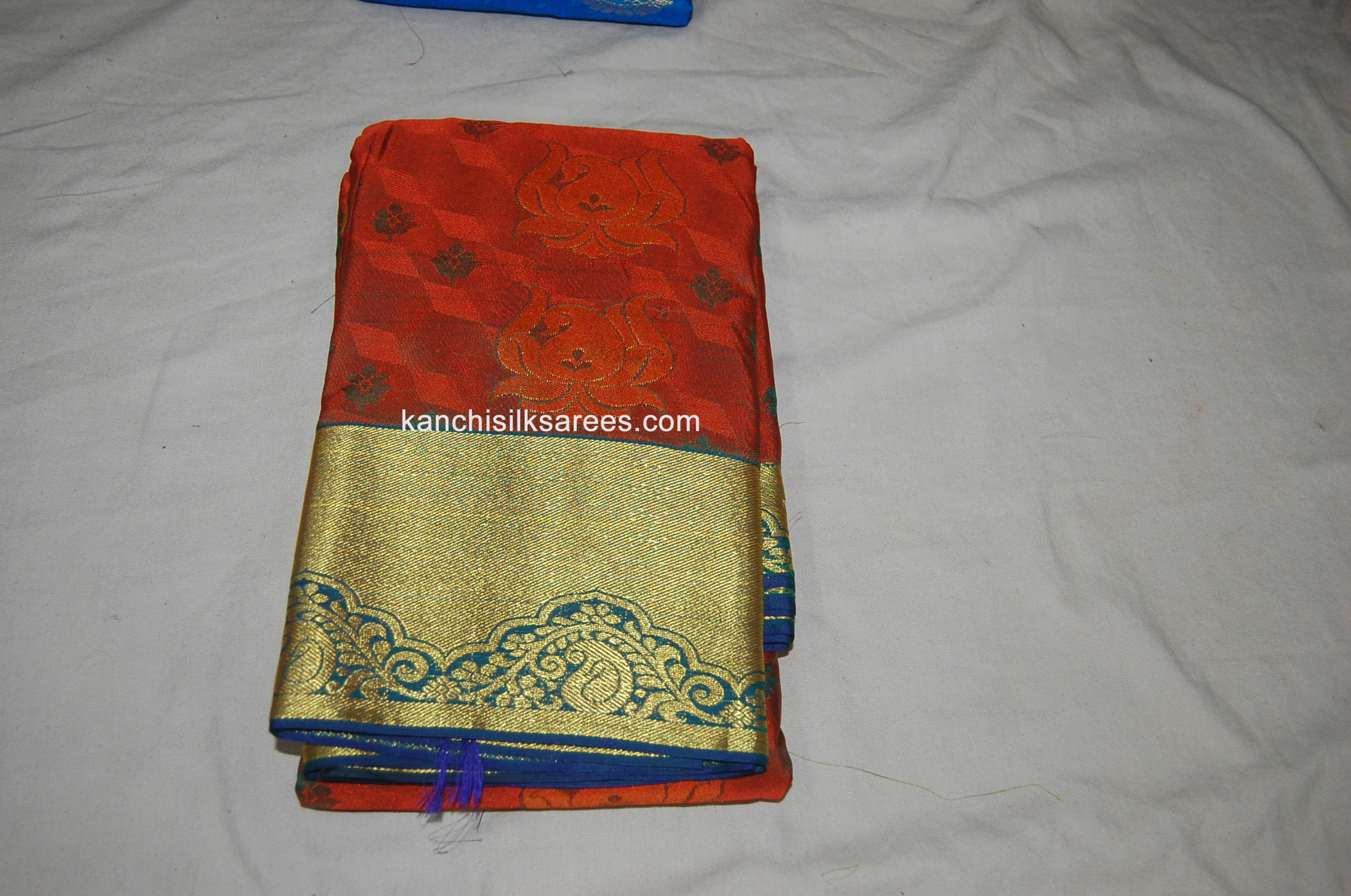 Kanchipuram Soft Silk Sarees Mango and Lotus Flower Design Fire Brick Orange w/ Admiral Blue Color