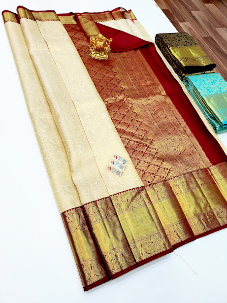 Kanjivaram Pure Bridal Silk Saree Off White w/ Red Color