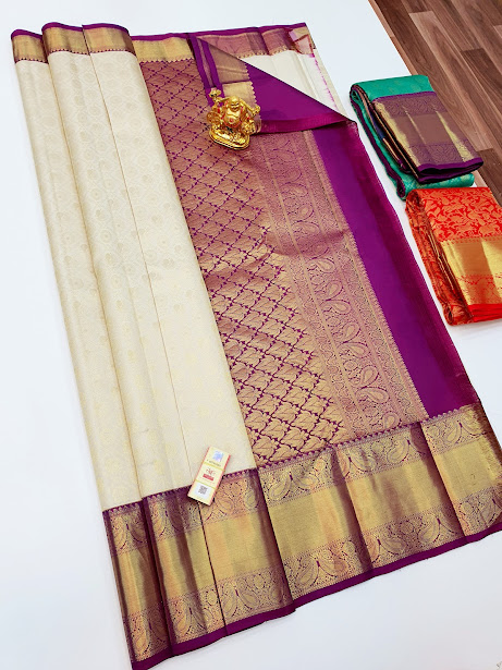 Kanjivaram Pure Silk Saree Bridal Collection Body White Porter Violet Color