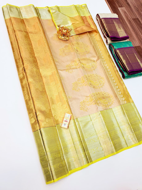 Kanjivaram Pure Silk Wedding Sarees Gold Zari w/ Yellow Color With Blouse