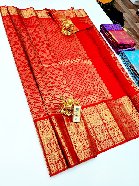 Kanjivaram Pure Wedding Silk Saree Chilli Red Color w/ Blouse