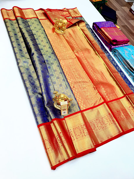 Kanjivaram Pure Wedding Silk Saree Copper Blue Color w/ Blouse
