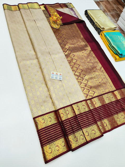 Kanjivaram Pure Wedding Silk Saree Cream Color w/ Blouse