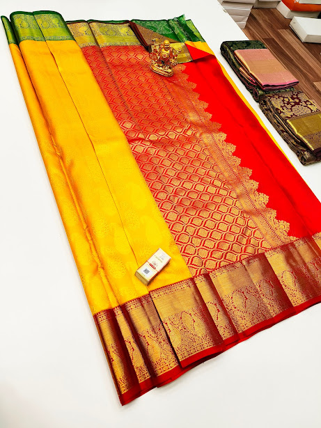 Kanjivaram Pure Wedding Silk Saree Mango Yellow Color w/ Blouse