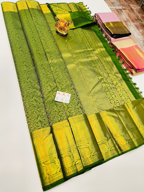 Kanjivaram Pure Wedding Silk Saree Olive Green Color w/ Blouse