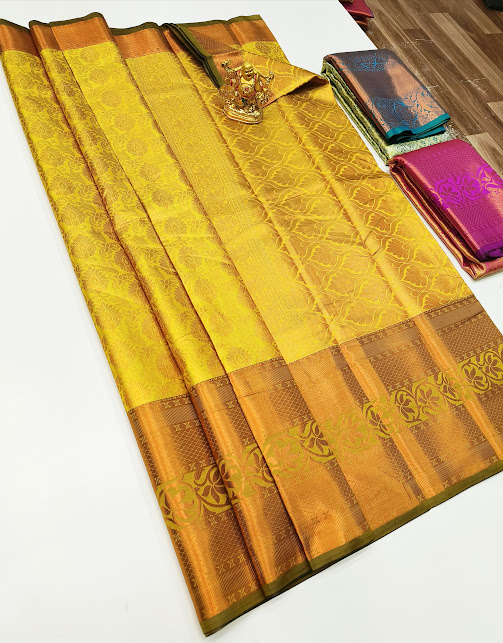 Kanjivaram Semi Silk Saree Lemon Yellow Color w/ Blouse