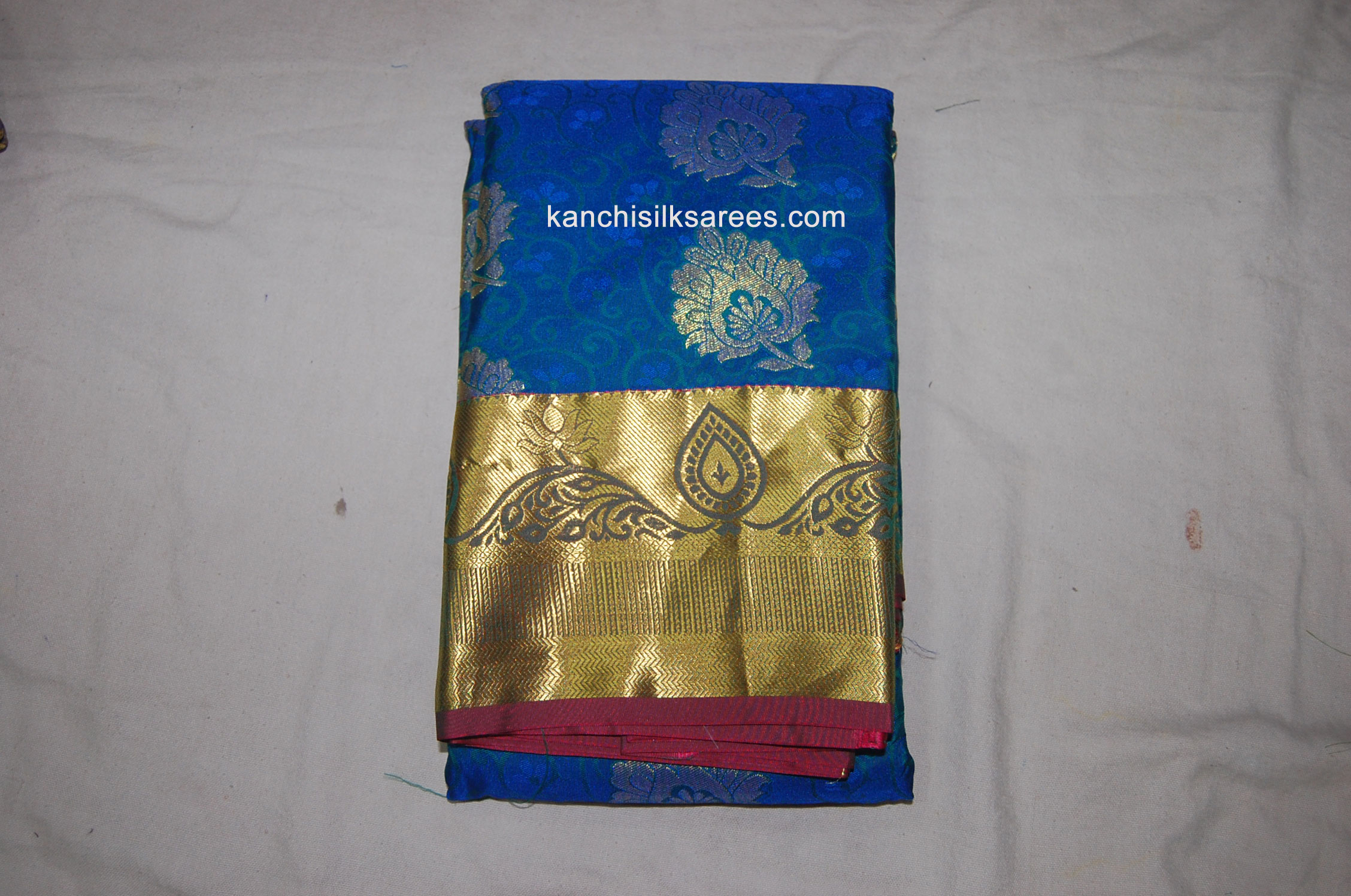 Kanjivaram Soft Silk Sarees Lotus and Flower Design Dark Cerulean w/ Siren Red Color
