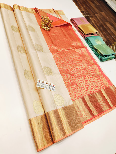Latest and Trendy Design Pure Kanjivaram Fancy Silk Saree Off White Color w/ Blouse