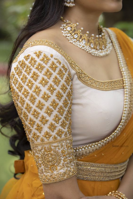 This latest beautiful blouse features intricate thread and pearl work in a classic white color. It has a round neckline, long sleeves with pearl and thread detailing, and a keyhole opening at the back with a button closure. The blouse is made of a soft and lightweight fabric that drapes nicely and feels comfortable against the skin. The unique thread and pearl work makes this blouse a great choice for special occasions and will be sure to make you stand out from the crowd.