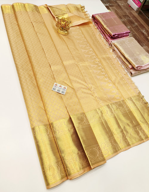 Latest Design Kanjivaram Pure Wedding Silk Saree Golden Color w/ Blouse