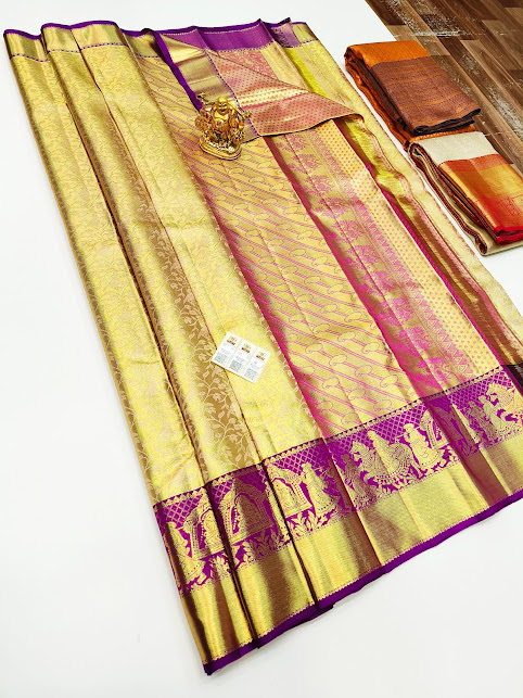 Latest Design Kanjivaram Pure Wedding Silk Saree Golden Yellow Color w/ Blouse