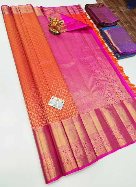Latest Design Kanjivaram Pure Wedding Silk Saree Orange and Pink Color w/ Blouse