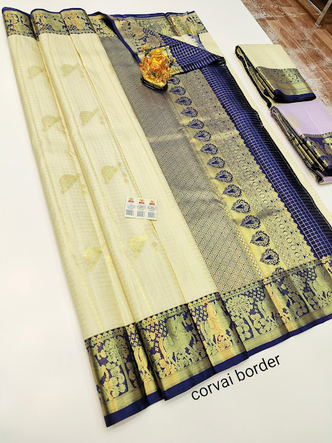 Latest Design Pure Kanjivaram Fancy Silk Saree Off White Color w/ Blouse