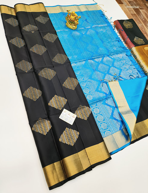 Latest Design Pure Soft Silk Saree Black and Blue Color w/ Blouse
