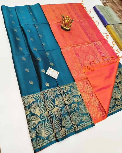 Latest Design Pure Soft Silk Saree Copper Blue Color w/ Blouse