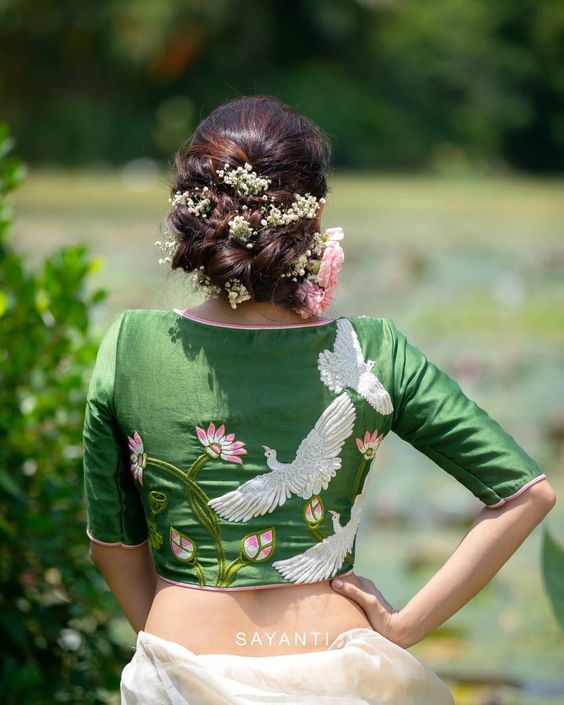 Latest Hand Work Birds Embroidered Party Blouse Green Color