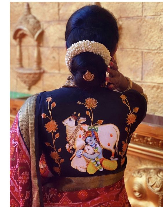 Latest Lord Krishna and Cow Hand Thread Work Designer Blouse Dark Blue Color