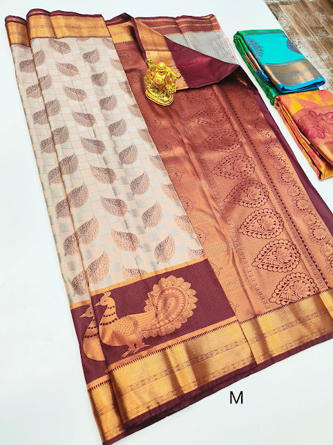 Leaf and Peacock Design Kanchi Semi Silk Saree White Color w/ Blouse