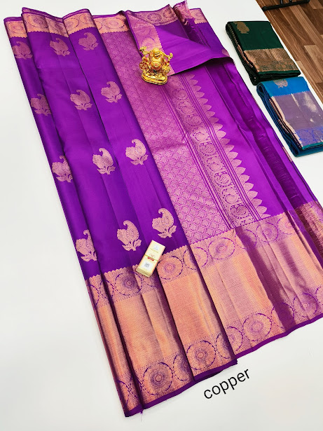Mango and Flower Design Copper Zari Work Pure Kanjivaram Fancy Silk Saree Magenta Color w/ Blouse