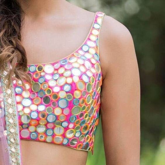 Whats App for Latest Sarees & DesignsMirror work blouse backs are an elegant and glamorous way to dress up for any occasion. This particular multi colored blouse features intricate mirror work on the back. The design is usually done with small mirrors, beads, and sequins, in a geometric pattern. The result is a stunning and eye-catching blouse that is sure to make a statement.