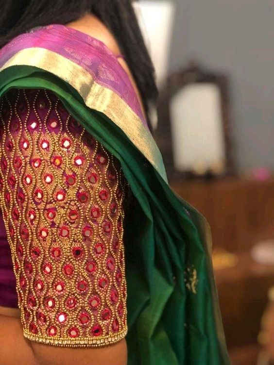 This style of blouse features intricate embroidery and mirror work for a unique and beautiful look. The embroidery is done in a variety of colors, with pink being the primary color. The designs are elaborate and often feature floral designs or other intricate motifs. The mirror work adds a touch of sparkle and glamour to the blouse. The combination of pink and other colors in this style of blouse make it a perfect choice for brides.