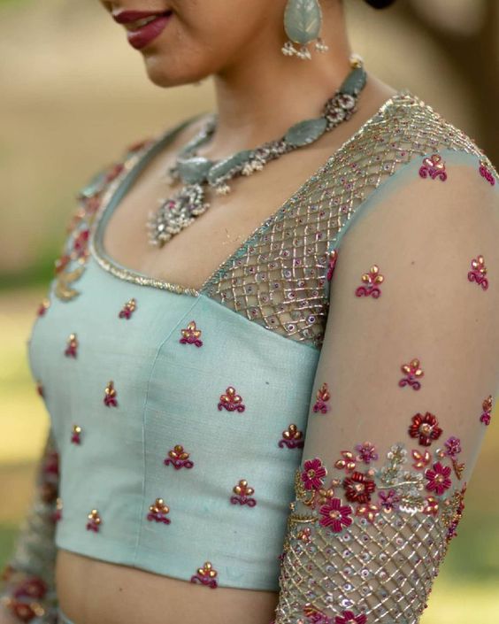 Whats App for Latest Sarees & DesignsThis modern netted embroidery work bridal blouse is made of sky blue fabric. It features an intricate netted embroidery work design on the front and back of the blouse. The neckline, cuffs and hemline are decorated with delicate embroidery work, while the puff sleeves add a touch of modernity and style to the blouse.