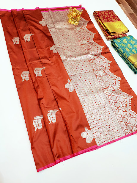 Musical Instrument Design Kanjivaram Semi Silk Saree Orange Color w/ Blouse