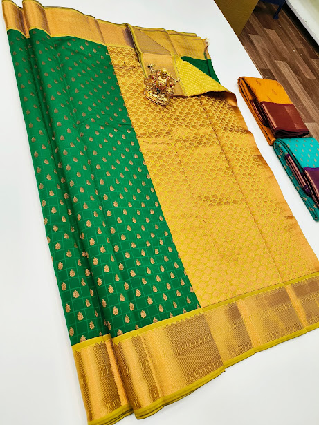New Design High Fancy Kanjivaram Silk Saree Mix Green and Yellow Color w/ Blouse