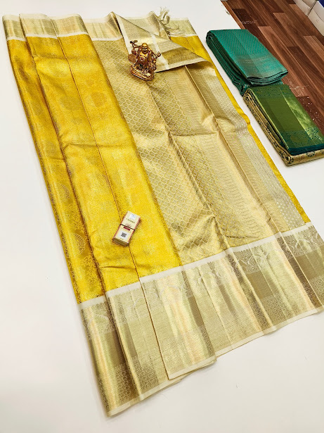New Design Kanjivaram Pure Wedding Silk Saree Lemon Yellow Color w/ Blouse