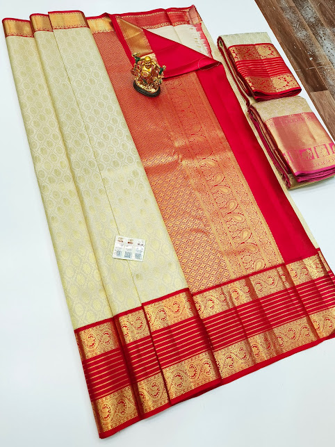 New Design Kanjivaram Pure Wedding Silk Saree Off White Color w/ Blouse