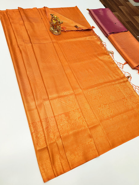 New Design Kanjivaram Semi Silk Saree Fanta Orange Color w/ Blouse