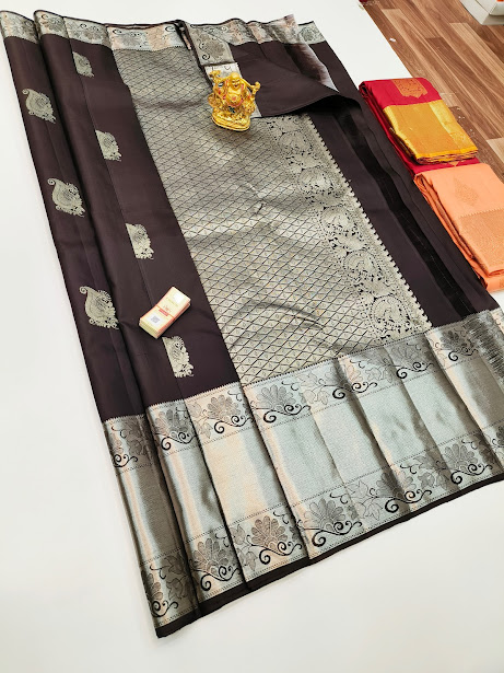New Design Pure Kanjivaram Fancy Silk Saree Dark Brown Color w/ Blouse