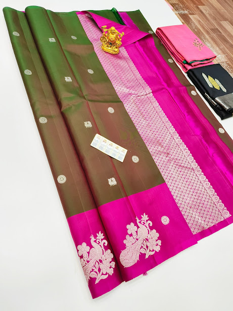 New Design Pure Kanjivaram Fancy Silk Saree Mango Leaf Color W/ Blouse