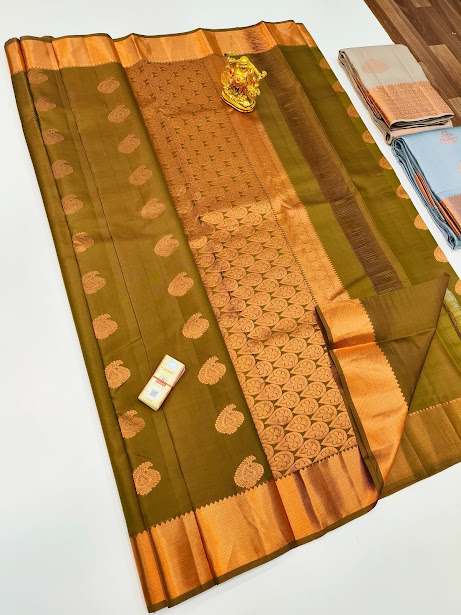 New Design Pure Soft Silk Saree Olive Green Color w/ Blouse