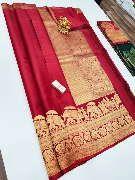 New Elephant Design Pure Kanjivaram Fancy Silk Saree Apple Red Color w/ Blouse