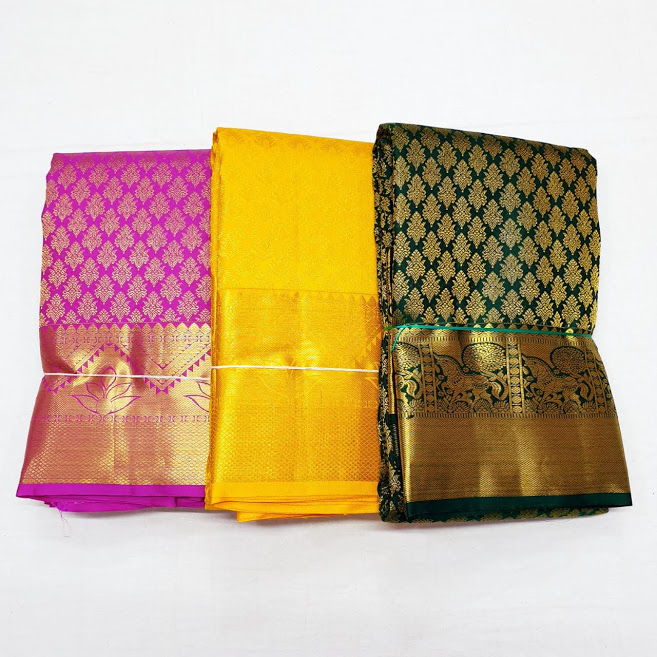 Whats App for Latest Sarees & DesignsSpecification: New Flower Design Kanchipuram Silk Saree Bridal Collection Gold Jari Work (Pink / Lemon Yellow / Bottle Green)