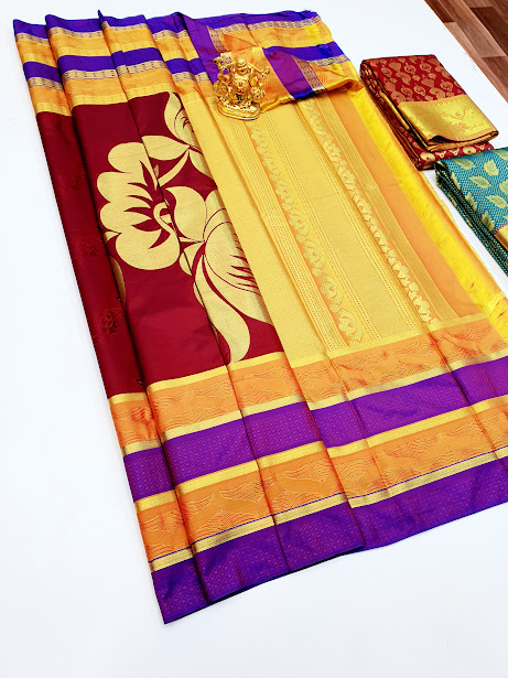 New Flower Design Kanjivaram Semi Silk Saree Kumkum Red Color w/ Blouse