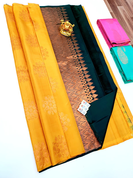 New Flower Design Pure Soft Silks Sarees Yellow w/ Dark Green Color w/ Blouse