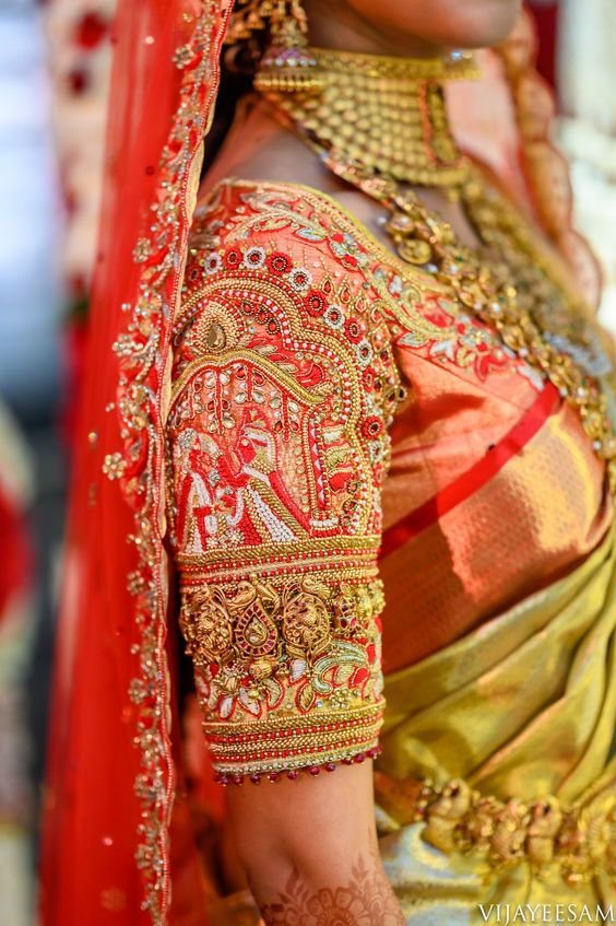 • Color / Design – Chilli Red Color Hand Pearls and Thread Work Design