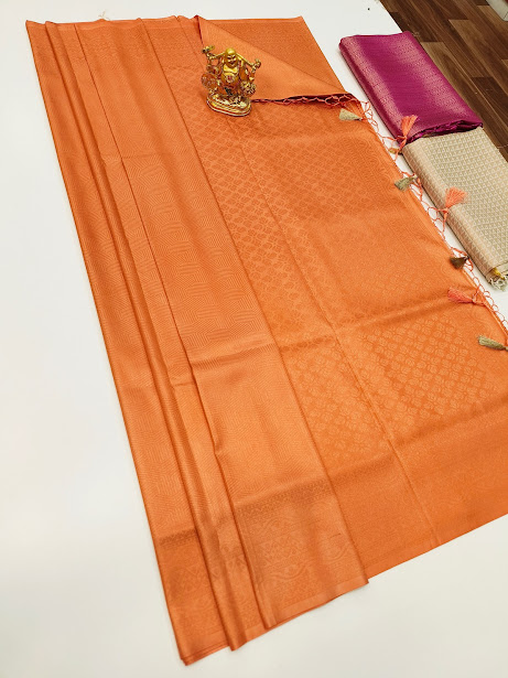 New Trendy Design Kanjivaram Semi Silk Saree Orange Color w/ Blouse