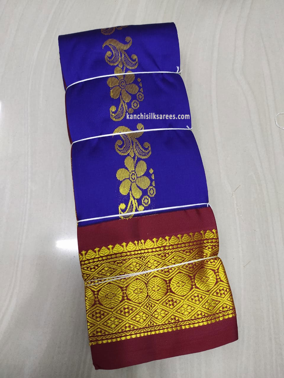 One Side Border Kanchipuram Gift Silk Sarees Flower Design Ink Blue w/ Jam Red Color