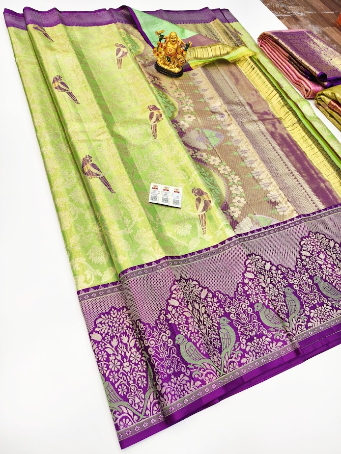 Parrot Design and Thread Work Pure Kanjivaram Silk Saree Parrot Green Color w/ Blouse