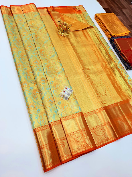 Peacock and Flower Design Kanjivaram Pure Silk Saree Golden Zari Color w/ Blouse