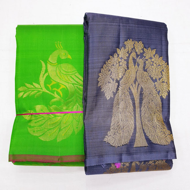Whats App for Latest Sarees & DesignsSpecification: Peacock Design Kanjivaram Pure Soft Silk Saree (Parrot Green / Grey)