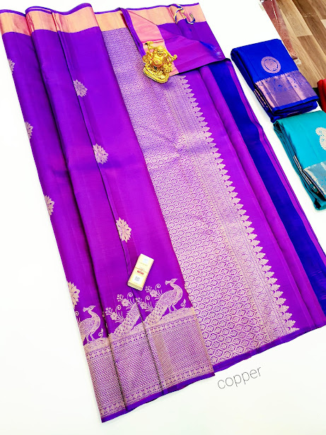 Peacock Design Pure Kanjivaram Fancy Silk Saree Purple Color w/ Blouse