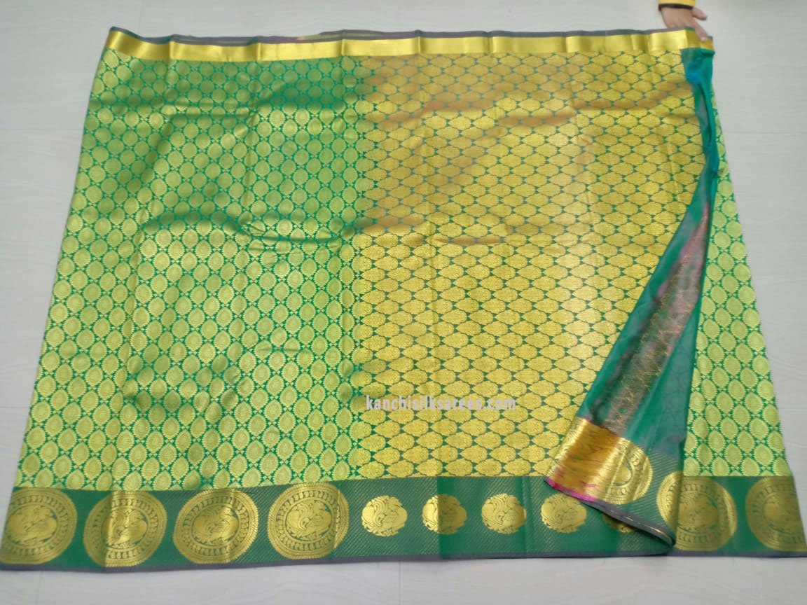 Peacock Flower Design Kanchipuram Pure Silk Sarees Ocean Green Color